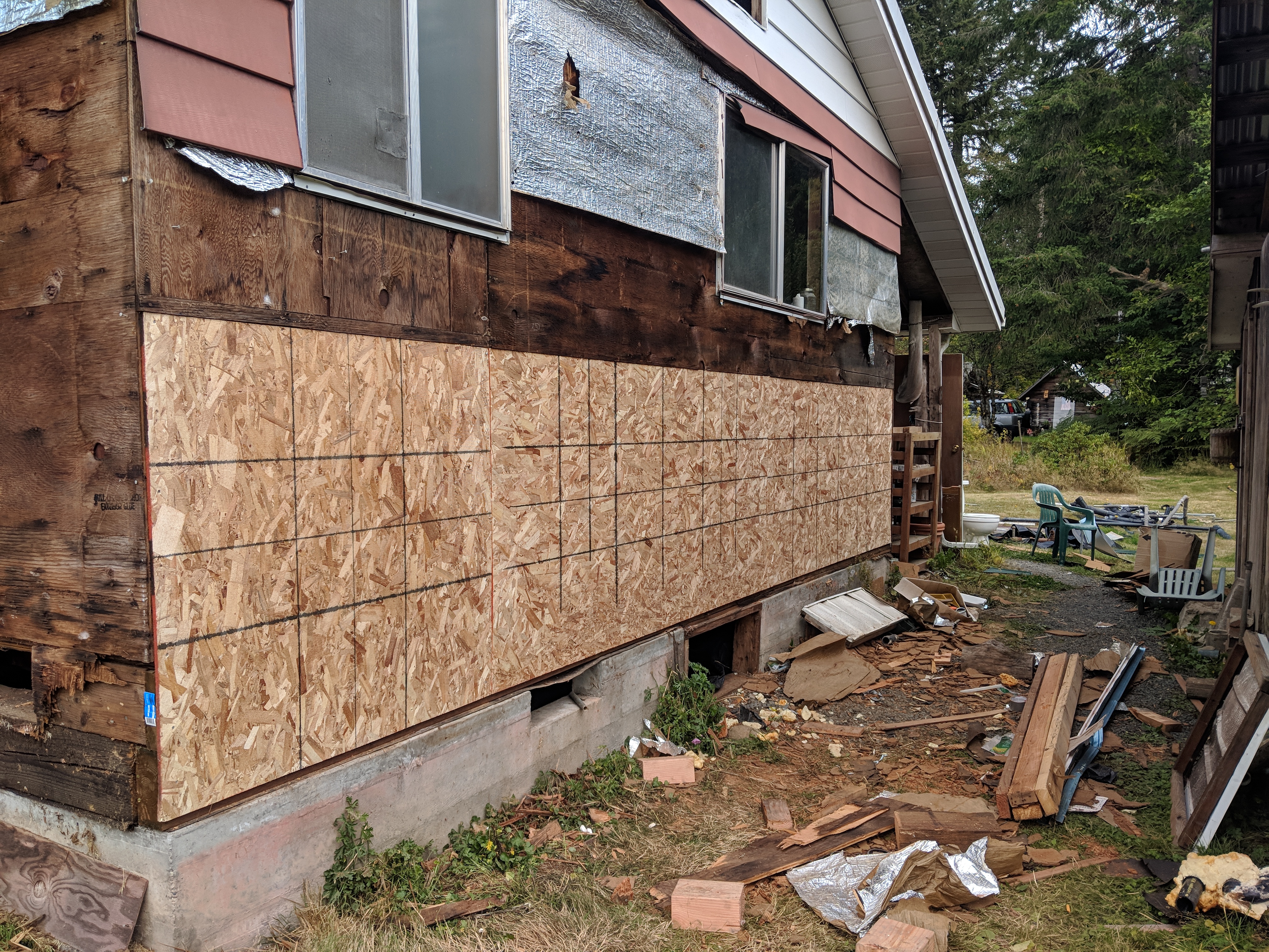 Electrical work resumed but was put on hold again because the windows were due to arrive. So, the remaining siding was removed and then the windows and house wrap were put into place.