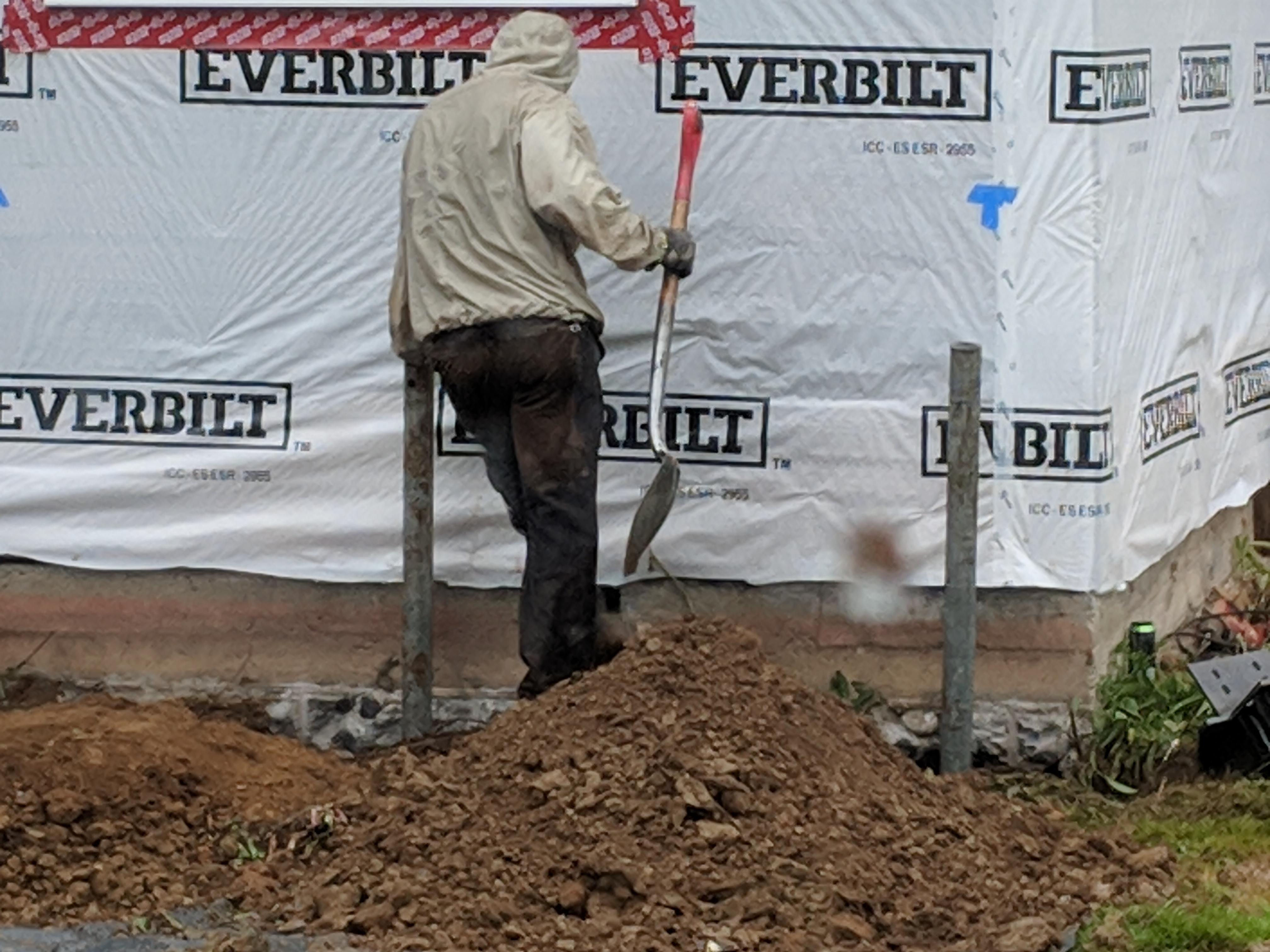 Electrical resumed, again, and continued while – wait for it – the foundation company got busy! This was an interesting process to watch. First, they got the miniature style backhoe tearing out the vegetation that I couldn’t bring myself to remove. I know it needed to go, but it’s really hard for me to tear out beautifully, well-established flower beds, even when necessary. The backhoe did most of the digging, but one corner was dug mostly by hand since we had electrical wire running underground in the area.