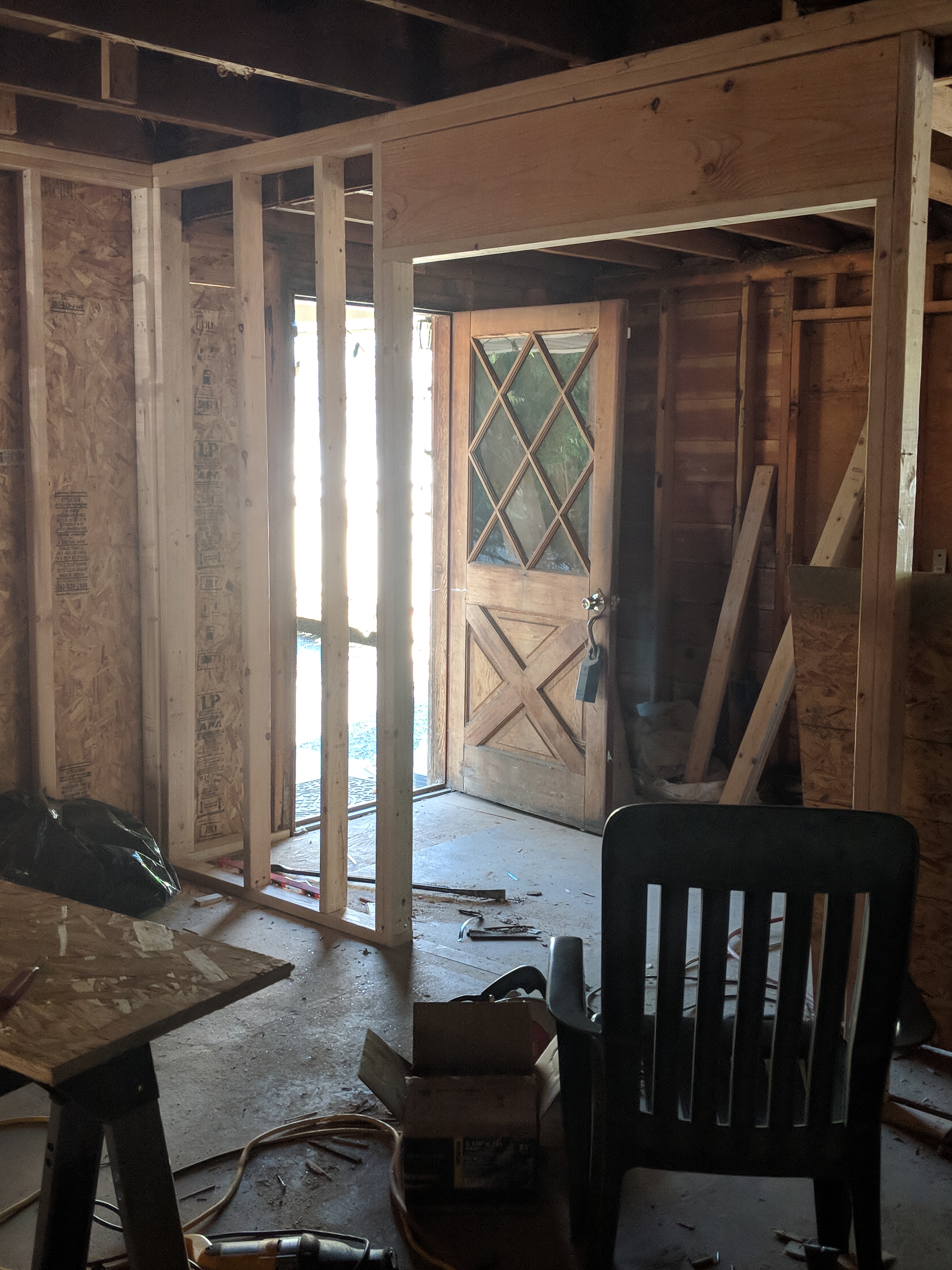 First, the sill plate and all the rotted framing in the front of the house is complete! The whole front is just boarded up for now and will be cut when the window is installed. Side note: windows are suppose to arrive today! We’ll see if they make it, but they should be here very soon!
